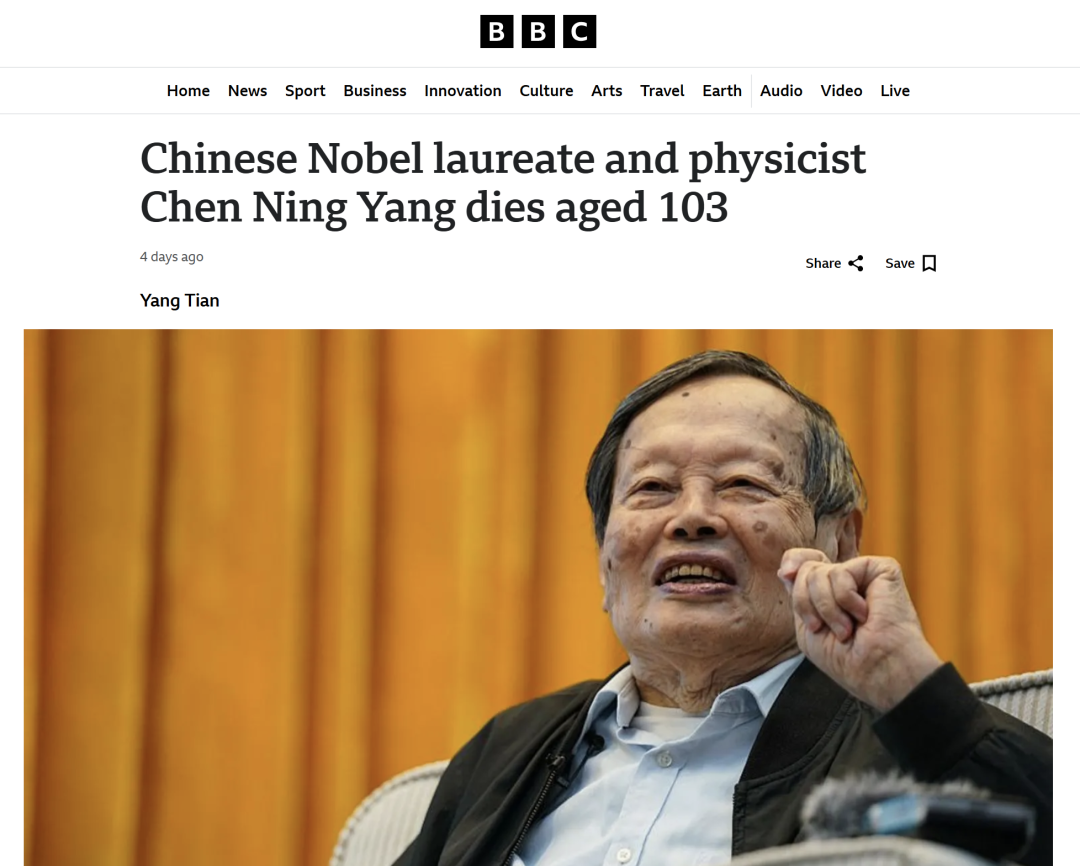 2025年10月18日,BBC(英国广播公司)报道了物理学家杨振宁逝世的消息: